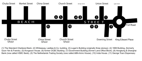| Beach Street | Lebuh Pantai | Self-describing. The street ran along the shoreline until the construction of Weld Quay. | N. of China St | பீச் வீதி Pīc Vīti | |||