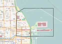 Streeterville is a neighborhood in the Near North Side community area of Chicago, Illinois, United States, north of the Chicago River. It is bounded by the river on the south, the Magnificent Mile portion of Michigan Avenue on the west, and Lake Michigan on the north and east, according to most sources, although the city of Chicago recognizes only a small portion of this region as Streeterville. Thus, it can be described as the Magnificent Mile plus all land east of it. The tourist attraction of Navy Pier and Ohio Street Beach extend out into the lake from southern Streeterville.[1][2] To the north, the East Lake Shore Drive District, where the Drive curves around the shoreline, may be considered an extension of the Gold Coast. The majority of the land in this neighborhood is reclaimed sandbar.[3]