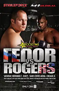 Strikeforce/M-1 Global: Fedor vs. Rogers was a mixed martial arts event held on November 7, 2009 promoted by Strikeforce in association with M-1 Global. It was the first MMA event on network television since the now-defunct EliteXC promotion broadcast its final event, EliteXC: Heat, on CBS on October 4, 2008. The event had a four-fight main card with a broadcasting team of Gus Johnson, Frank Shamrock and Mauro Ranallo.[2] The event drew an estimated 4,040,000 viewers, with a peak at 5,460,000 on CBS.[3]
