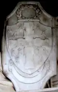 His arms were: Ermine, a cross raguly gules, as is visible without tinctures on his monuments in Westminster Abbey and Dunchideock, and with tinctures on the vestry screen of Dunchideock Church. These are the arms of Sir John Lawrence (d.1692)[4] Lord Mayor of London in 1665, which in 1839 were visible on the monument to Sir Thomas Gresham in St Helen's Church, Bishopsgate, City of London,[5] apparently a difference of the ancient arms of Lawrence of Ashton Hall, Lancashire. They also feature in the arms of John Lawrence, 1st Baron Lawrence (1811-1879), Viceroy of India.[6]