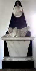 The East India Company erected a monument to Stringer[7] in white and coloured marble by the sculptor William Tyler (1728-1801), situated in the north aisle of the nave of Westminster Abbey. His bust stands on a pedestal at the top, below which is a medal inscribed "Born March 6, 1697; died January 10, 1775". On the left side below is a winged figure of Fame holding an oval shield inscribed: "For Discipline Established, Fortresses Protected, Settlements Extended, French and Indian Armies Defeated, and Peace Concluded in the Carnatic". On the right side below is a female figure seated on a bale, representing the East India Company. She points towards Lawrence's bust and at her feet are shown various French and Indian flags. An heraldic escutcheon on the front of the pedestal shows the arms of Lawrence: Ermine, a cross raguly gules.[8] Also on the pedestal is a panel containing a relief sculpted perspective of a city and an encampment, inscribed: "Tritchinopoly", which town Lawrence defended against the French from May 1753 to October 1754. The main inscription on the black marble base is as follows:
