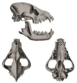 The skull is entirely typical of the genus, having a very high sagittal crest, a shortened facial region and an inflated frontal bone.[28] The skull of the striped hyena differs from that of the brown[6] and spotted hyena by its smaller size and slightly less massive build. It is nonetheless still powerfully structured and well adapted to anchoring exceptionally strong jaw muscles[5] which give it enough bite-force to splinter a camel's thigh bone.[27] Although the dentition is overall smaller than that of the spotted hyena, the upper molar of the striped hyena is far larger.[5] The dental formula is 3.1.4.0–13.1.3.1.