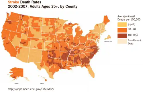 - ^ a b Casper ML, Wing S, Anda RF, Knowles M, Pollard RA (May 1995). "The shifting stroke belt. Changes in the geographic pattern of stroke mortality in the United States, 1962 to 1988". Stroke. 26 (5): 755–60. doi:10.1161/01.str.26.5.755. PMID 7740562.