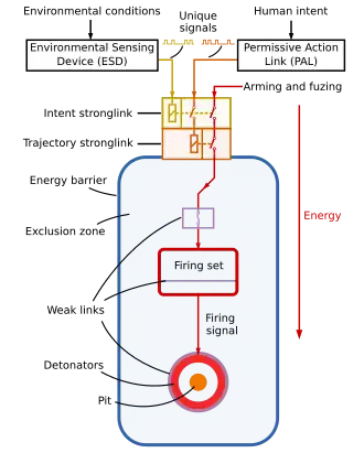 A strong link/weak link and exclusion zone nuclear detonation mechanism is a type of safety mechanism employed in the arming and firing mechanisms of modern nuclear weapons.[1]