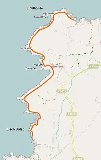 The site, which runs along a coastal strip some six miles in length on the western edge of the Strumble Head promontory, broadly covers the area from Strumble Head Lighthouse (on Ynys Meicel) in the north to the cliff named Llech Dafad in Welsh ('sheep slab'), spelt as two separate words on Ordnance Survey maps, in the south. The SSSI has an area of 204.63 hectares. It is managed by Natural Resources Wales.