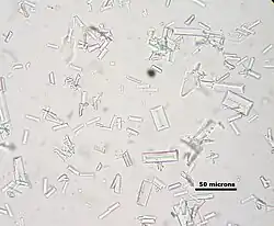 - Struvite crystals in a human urine sample with a pH of 9. Abundant amorphous phosphate crystals, several squamous and non-squamous epithelial cells and a few leukocytes can also be observed.