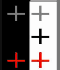 In the top row, a grey cross looks apparently darker on a light than on a dark surround. This well-known lateral brightness induction is probably caused by neural lateral inhibition. But in the second row, a cross that flickers at 8 Hz between black and white looks almost black on a light surround and almost white on a dark surround - stronger apparent contrast? And in the bottom row, both yellowish and the cross on the light surround looks reddish. Clearly, the achromatic surrounds are not inducing any colors—nothing is being induced. Instead, the visual system selects the phase that has the higher contrast and hence the greater salience.