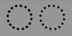 Both rings of spots rotate clockwise, but one the right the spots reverse their polarity on every frame, being black-white-black-white.... This makes them appear to be rotating counterclockwise. this 'reverse phi' suggests that ON and OFF neural channels can cooperate to sense movements.