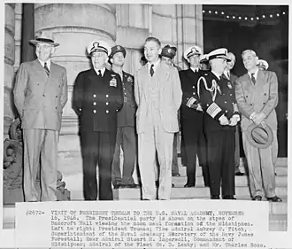 Ingersoll as a rear admiral and United States Naval Academy Commandant of Midshipmen during a visit by President Harry S Truman on 16 November 1946. Left to right are Truman, Academy Superintendent Vice Admiral Aubrey W. Fitch, presidential physician General Wallace Graham, Secretary of the Navy James Forrestal, Ingersoll, Fleet Admiral William D. Leahy, and Presidential press secretary Charlie Ross.