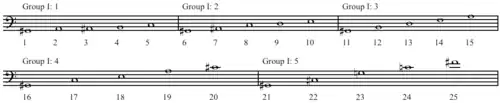 The idea at the core of Studie II was the decision to extrapolate everything from the number 5. Five main sections are each divided into five subsections, and each subsection contains five groups consisting of one to five sounds, called "tone mixtures". Each of these tone mixtures is constructed as five equally spaced, reverberated sine tones. The width of the tone mixtures remains constant within each group, but changes from group to group in five widths derived from an underlying scale.[8] For the pitches, Stockhausen built a scale in which the interval between successive steps consists of the frequency proportion —in other words, the interval of 5:1 (two octaves plus a just major third) is divided into 25 equal parts. This differs from the traditional tempered tuning system, in which an octave consists of twelve segments, the interval between two adjacent steps being therefore defined by the ratio . The intervallic unit is a "large semitone", about 10% larger than the semitone of the equal-tempered twelve-tone system (ⓘ). Beginning at 100 Hz, this scale reaches to ca. 17,200 Hz, with a total of 81 equally spaced pitches. Because of the chosen basic interval, no octave duplications can occur.[9] The highest pitch, 17,200 Hz, is near the upper limit of human hearing, and occurs only in a single tone mixture, as the uppermost of its five pitches.[8]