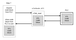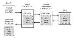 According to researcher Ralph Langner,[73][74] once installed on a Windows system, Stuxnet infects project files belonging to Siemens' WinCC/PCS 7 SCADA control software[75] (Step 7), and subverts a key communication library of WinCC called s7otbxdx.dll. Doing so intercepts communications between the WinCC software running under Windows and the target Siemens PLC devices, when the two are connected via a data cable. The malware is able to modify the code on PLC devices unnoticed, and subsequently to mask its presence from WinCC if the control software attempts to read an infected block of memory from the PLC system.[68]