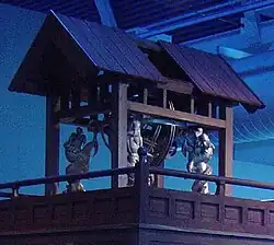 Su Song was the engineer for a hydro-mechanical astronomical clock tower located in Kaifeng. It employed an early escapement mechanism.[2][3][4][5] The escapement mechanism of Su's clock tower was invented by the Tang dynasty Buddhist monk Yi Xing and government official Liang Lingzan in 725 AD to operate a water-powered armillary sphere, however Su's armillary sphere was the first to utilize a mechanical clock drive.[5][6][7] Su's clock tower also featured the oldest known endless power-transmitting chain drive, called the tian ti (天梯), or "celestial ladder", as depicted in his horological treatise.[8] The clock tower had 133 different clock jacks to indicate and sound the hours.[9] The clock was dismantled by the invading Jurchen army in 1127 AD, and although attempts were made to reassemble it, the tower was never successfully reinstated.