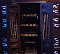 Su Song's greatest project was the 40-foot-tall water-powered astronomical clock tower constructed in Kaifeng, the wooden pilot model completed in 1088, the bronze components cast by 1090, while the wholly finished work was completed by 1094 during the reign of Emperor Zhezong of Song.[38][39] The emperor had previously commissioned Han Gonglian, Acting Secretary of the Ministry of Personnel, to head the project, but the leadership position was instead handed down to Su Song. The emperor ordered in 1086 for Su to reconstruct the hun yi, or "armillary clock", for a new clock tower in the capital city. Su worked with the aid of Han Gong-lian, who applied his extensive knowledge of mathematics to the construction of the clock tower.[40] A small-scale wooden model was first crafted by Su Song, testing its intricate parts before applying it to an actual full-scale clock tower.[41] In the end, the clock tower had many impressive features, such as the hydro-mechanical, rotating armillary sphere crowning the top level and weighing some 10 to 20 tons,[41] a bronze celestial globe located in the middle that was 4.5 feet in diameter,[41] mechanically timed and rotating mannequins dressed in miniature Chinese clothes that exited miniature opening doors to announce the time of day by presenting designated reading plaques, ringing bells and gongs, or beating drums,[42] a sophisticated use of oblique gears and an escapement mechanism,[43] as well as an exterior facade of a fanciful Chinese pagoda. Upon its completion, the tower was called the Shui Yun Yi Xiang Tai, or "Tower for the Water-Powered Sphere and Globe". Joseph Needham writes: