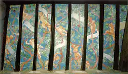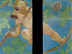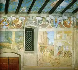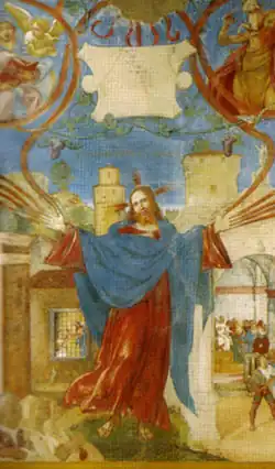 Lotto also frescoed the ceiling between (and using) the beams, creating a fake pergola against a bright blue background, with playing putti and cartouches with biblical and liturgical passages about vines and wine as used in the mass.[4] The brushwork is quick but efficient and the work's taste for popular narration (typical of Lotto) remains wedded to the north Italian tradition.