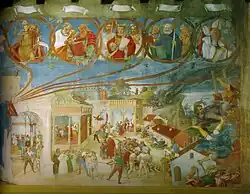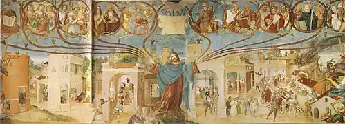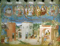 Either side of the figure of Christ are a series of buildings and landscapes, all showing scenes from the life of Saint Barbara, her conversion and her martyrdom under Maximian and Diocletian. They are set in city scenes such as a marketplace, giving a popular and lively feel to the storytelling.[8] The figures are smaller than the saints in the upper register and show the saint's life as an unheroic one, a series of anecdotes, similar to works from northern Europe at that time, anti-rhetorical and anti-classical, as do the unusual colours chosen, from yellow with violet, pink with green and white with brown. This conception of scenes within an architectural setting owed much to the example of the Sacro Monte di Varallo.[6]