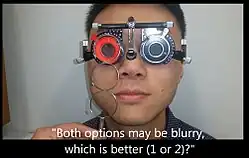 Subjective Refraction is a technique to determine the combination of lenses that will provide the best corrected visual acuity (BCVA).[1] It is a clinical examination used by orthoptists, optometrists and ophthalmologists to determine a patient's need for refractive correction, in the form of glasses or contact lenses. The aim is to improve current unaided vision or vision with current glasses. Glasses must also be comfortable visually. The sharpest final refraction is not always the final script the patient wears comfortably.