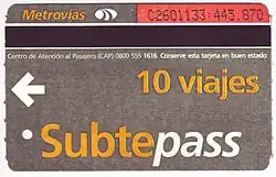 Subtepass is the electronic smartcard used for trips on the Buenos Aires Metro. In addition to the regular Subtepass, there are special discounted and free versions available, based on category. Secondary and tertiary school students may purchase a discounted Abono Estudiantil (Spanish: Student Pass). Teachers that are employed by the city school system may purchase a discounted Abono Maestro (Spanish: Teacher Pass). Students in primary school may ride the metro to and from school for free with a Pase Escolar Primario (Spanish: Primary School Pass), provided they are wearing their white smock uniform. In addition, retirees, pensioners, and certain classes of retired military personnel are eligible for a free Pase Jubilados y Pensionados (Spanish: Retiree and Pensioner Pass). There are also free passes for visually impaired and disabled persons.[1]