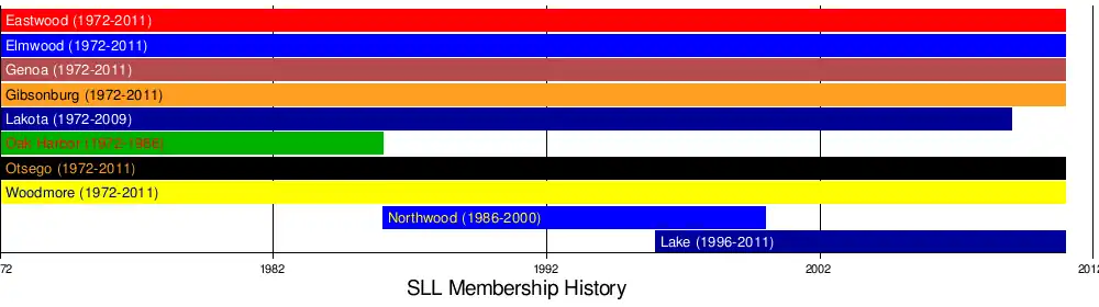 - For the 1972-73 school year, Eastwood, Elmwood, and Genoa leave the Northern Lakes League to form the SLL with Gibsonburg, Lakota, and Oak Harbor from the Sandusky Bay Conference, and Otsego and Woodmore from the Lakeshore Conference. Geographic location and comparable athletic competition were acknowledged as sound reasons for establishing the league.[2]