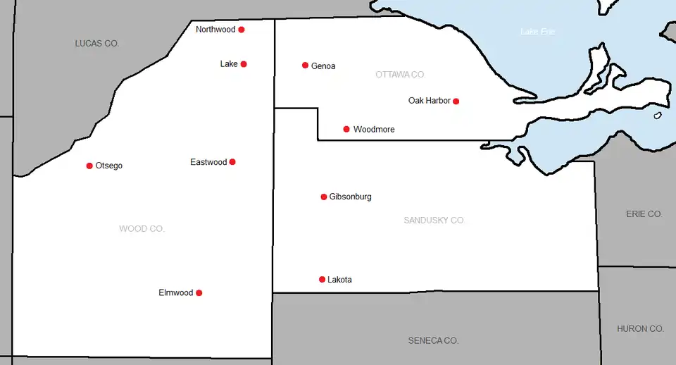 - In May 2009, Eastwood, Genoa, Lake, Otsego, and Woodmore agreed to withdraw from the Suburban Lakes League and form a new league with Rossford.[8] This was an attempt to circumvent the bylaws of the league after Rossford was voted down by a 5-2 vote (Rossford needed 75% (6 out of 7) of the vote to be added into the SLL). It was decided that league play for the new Northern Buckeye Conference would begin in the fall of 2011. This move left Elmwood and Gibsonburg as the lone members of the SLL for that time.