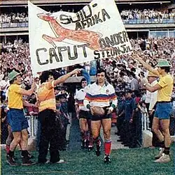 The Jaguars was a 'shadow' Argentine national team, not officially recognised by the UAR as a stratagem to elude the prohibition of the Argentine government that since the early 1970s forbade any official relationship between any Argentine sport federation and South African and Rhodesian ones, due to the apartheid politics of those countries.[5] This ostracism had started in 1971 when the Argentine government forbade the Pumas to play a match in Rhodesia during the tour in South Africa.[6]