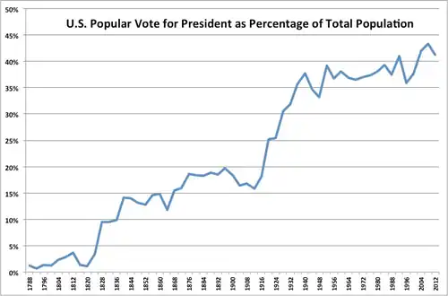 - 1792–1856: Abolition of property qualifications for white men, from 1792 (New Hampshire) to 1856 (North Carolina) during the periods of Jeffersonian and Jacksonian democracy. However, tax-paying qualifications remained in five states in 1860—Massachusetts, Rhode Island, Pennsylvania, Delaware and North Carolina. They survived in Pennsylvania and Rhode Island until the 20th century.[18]
