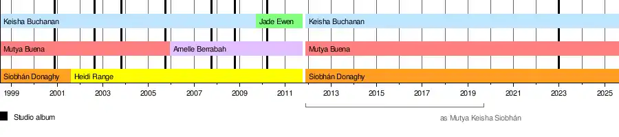 In 2009, after 11 years in Sugababes, Buchanan, the final original member, was replaced by Jade Ewen. Sugababes released Sweet 7 (2010), after which they signed to RCA Records, before taking an indefinite hiatus in 2011 following the release of their single Freedom. That year, the original lineup re-formed as Mutya Keisha Siobhán and released the single "Flatline" in 2013. The trio regained the name Sugababes in 2019, and in 2021, the Sugababes rereleased One Touch for its 20th anniversary. In 2022, they released The Lost Tapes, an album of previously unreleased leaked material. The first single from their upcoming album, slated for a 2025 release, came in March 2025. Sugababes are an independent group, self-releasing their material, as of 2025.[2]