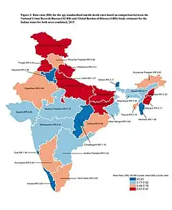 - ^ Arya, Vikas; Page, Andrew; Armstrong, Gregory; Kumar, Anil G.; Dandona, Rakhi (1 June 2021). "Estimating patterns in the under-reporting of suicide deaths in India: comparison of administrative data and Global Burden of Disease Study estimates, 2005–2015". Journal of Epidemiology and Community Health. 75 (6): 550–555. doi:10.1136/jech-2020-215260. hdl:11343/252706. PMID 33257456.