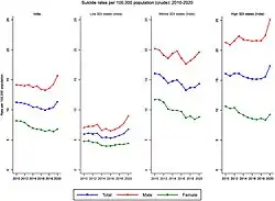 - ^ Arya, Vikas; Page, Andrew; River, Jo; Armstrong, Gregory; Mayer, Peter (1 March 2018). "Trends and socio-economic determinants of suicide in India: 2001–2013". Social Psychiatry and Psychiatric Epidemiology. 53 (3): 269–278. doi:10.1007/s00127-017-1466-x. PMID 29209745.