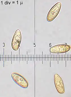The spore print is olive to brownish olive. Under the microscope, the spores are elliptical to somewhat fusiform (spinde-shaped), measuring 11–15 μm long by 4.5–6.5 μm wide and have a median spore quotient of 2.2.[43][25] The basidia (spore-bearing cells) are club-shaped and four-spored, and measure 29.2–36.5 by 11.0–12.4 μm. Cystidia on the sides of the tubes (pleurocystidia) are fuse-shaped with swollen middles and long necks, measuring 33–48 by 7.3–13.5 μm; cheilocystidia (on the edges of the pores) have a similar morphology. The cap cuticle is made of cylindrical hyphae 3.7–5.8 μm wide that are interwoven compactly, and the hyphal tips are erect and arranged in bundles. In contrast, the hyphae of the cap flesh is loosely interwoven with hyphae that are cylindrical and branched, measuring 3.7–8.8 μm. Hyphae do not contain clamp connections.[46]
