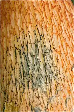 The carotenoid content of the fruit bodies differs substantially between the cap, the tubes, and the stem. The upper part of the cap, which contains 3.1 micrograms of carotenoid per gram (μg/g) fresh weight, has predominantly mutatochrome (47% of total carotenoids), 4-keto-α-carotene (40.2%), and δ-carotene (6.4%). The major carotenoids in the tubes (totaling 4.3 μg/g) include neurosporaxanthin (31.1%), auroxanthin (17.2%), 4-keto-α-carotene (17.1%), and rhodopin (15.8%). The stem (1.2 μg/g) contains primarily auroxanthin (32.5%), followed by 4-keto-α-carotene (19.9%), β-zeacarotene (18.5%), and rhodopin (11.4%).[88] The colour change observed with tissue injury is caused by variegatic and xerocomic acids, both of which turn blue when oxidized enzymatically upon exposure to air.[89]