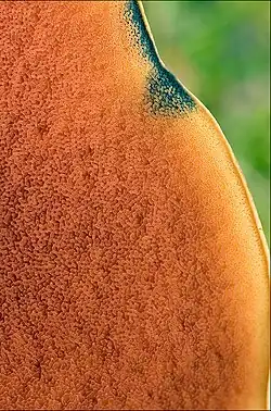 Suillellus luridus is a stout fungus with a thick yellow-olive to olive-brown convex cushion-shaped cap that can reach 20 cm (8 in) in diameter.[36] The cap colour tends to darken with age, and regions of red, orange, purple, brown, or olive-green can often be present.[37] The cap surface is finely tomentose (velvety) at first, becoming smoother with old age, and viscid in wet weather.[38] The pore surface is initially yellowish-orange or orange, before turning orange-red to sometimes red and stains strongly blue when injured or handled.[39][40] The pore surface usually has a lighter-coloured zone encircling the margin, as the pores tend to darken from their point of attachment to the stem outwards.[37][41] There are 2–3 rounded pores per millimetre, and the tubes are 1–2 cm (0.4–0.8 in) long.[39] The tubes are shorter around the cap margin and close to the stem, where they form a circular depression. Initially pale yellow, the tubes gradually become olive-yellow and stain bluish-green upon exposure to air.[37] A frequent feature is the presence of a maroon layer between the tubes and the flesh (known as Bataille’s line),[42] but this is not always present and subhymenial flesh can occasionally be yellow or straw-coloured.[25] The stem is 8–14 cm (3–6 in) tall and 1–3 cm (0.4–1.2 in) wide, and bears a distinctive, elongated (or "stretched") orange-red reticulum (network) pattern on a paler yellowish, orange, or ochre background, often becoming darker and vinaceous towards the base.[43][41] The flesh is yellowish, sometimes with red patches in the cap but almost always rhubarb to vinaceous-red towards the stem base, and stains an intense dark blue when bruised or cut. There is a faint sour smell, and the taste is described as mild.[36][38] The mycelium is an unusual yellow colour.[44]