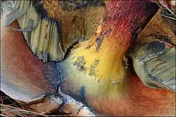Variety queletiformis can be distinguished from the main form by the reddish discolouration of the stem base that occurs both on the exterior surface and in the flesh.[45] Variety rubriceps has a deep crimson red cap, while var. lupiniformis has a pale yellow or dirty ochre cap and pores, sometimes with pink tones throughout.[37]