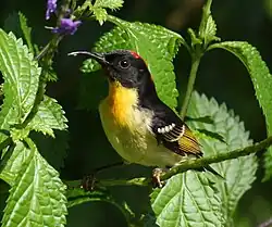 The sulphur-breasted myzomela is endemic to Fiji, where it is the smallest resident avian species. It breeds on all the islands except Rotuma. It is a familiar bird in gardens as well as rural forest and mangrove habitats,[2] and also among coconut trees in disturbed areas.[3] Its natural habitats are tropical moist lowland forests and subtropical or tropical mangrove forests.