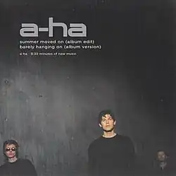 "Summer Moved On" is a song by Norwegian band a-ha, released as the group's first single in more than six years. The lead single from their sixth studio album, Minor Earth Major Sky (2000), the song was released in Europe on 25 March 2000 by WEA and was given a UK release on 22 May 2000. It was originally hastily written after a-ha agreed to a one-time reunion at the Nobel Peace Prize concert in 1998. The song became a number-one radio hit in much of Europe, including topping the chart in the band's native Norway. On the song, Morten Harket achieved the European record for the longest note held in a top-40 pop song; he sustains a chest voice note for 20.2 seconds (eight measures).[1] Its music video was directed by Adam Berg and filmed in Spain.