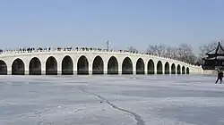 - 17-Arch Bridge (十七孔桥; 十七孔橋; Shíqīkǒngqiáo): Has 17 different types of arches on it. It incorporates features of the Precious Belt Bridge in Suzhou and the Lugou Bridge in Beijing. The entire bridge is 150 metres (490 ft) long and 8 metres (26 ft) wide.