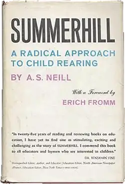 The publisher and Neill disagreed over the choice of writer for the book's foreword.[5] Seeing forewords as more of an American tradition, Neill preferred not to have one, but suggested Henry Miller, an American author who had recently written Neill a fan letter and whose Tropic series was banned in the United States.[5] Hart didn't think Miller's introduction would help the book[5] and approached Margaret Mead, who refused on the grounds of Neill's connection with Reich.[6] Several months later, psychoanalyst and sociologist Erich Fromm agreed to the project, and found consensus with Neill and the publisher.[6] Fromm's introduction placed Summerhill in a history of backlash against progressive education and claimed that the "perverted" implementation of child freedom was more at fault than the idea of child freedom itself.[6] He wrote that Summerhill was one of few schools that provided education without fear or hidden coercion,[7] and that it carried the goals of "the Western humanistic tradition": "reason, love, integrity, and courage".[8] Fromm also highlighted adult confusion about non-authoritarianism and how parents and teachers mistook coercion for genuine freedom.[6][9]