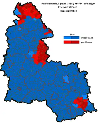 According to the 2001 Ukrainian census, ethnic Ukrainians accounted for 88.8% of the population of Sumy Oblast, and ethnic Russians for 9.4%.[15][16]