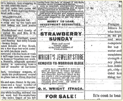 Supporting Ithaca's claim to be "the birthplace of the ice cream sundae", researchers at The History Center in Tompkins County, New York, provide an account of how the sundae came to be: On Sunday, April 3, 1892, in Ithaca, John M. Scott, a Unitarian Church minister, and Chester Platt, co-owner of Platt & Colt Pharmacy, created the first historically documented sundae.[10][14] Platt covered dishes of ice cream with cherry syrup and candied cherries on a whim. The men named the dish "Cherry Sunday" in honor of the day it was created. The oldest-known written evidence of a sundae is Platt & Colt's newspaper ad for a "Cherry Sunday" placed in the Ithaca Daily Journal on April 5, 1892. By May 1892, the Platt & Colt soda fountain also served "Strawberry Sundays" and later, "Chocolate Sundays".