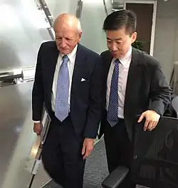 Professors John Curtis Perry and Sung-Yoon Lee; Perry was Lee's doctoral advisor, and subsequently colleague at the Fletcher School, developing a lifelong relationship of friendship and mentorship.[1][15] In this picture they are seen visiting, as part of an academic delegation, the Asan Institute for Policy Studies in Seoul, Korea, in 2015.