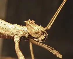 The females reach a length of 8.0 to 8.5 centimetres (3.1 to 3.3 in) and a weight of around five grams. At the end of the abdomen they have a beaked secondary ovipositor, typical of species of the Obriminae, which surrounds the primary ovipositor.[4] The nymphs and the freshly molted imago of the form known since 1995 are very light (beige). As they grow older, adult females become increasingly darker. What is striking is the crown of spines on the back of the head and the four flat spines on the meso- and metanotum. In light-colored females, these are often surrounded by a brown diamond pattern.[5]