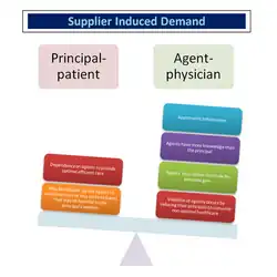 In health economics, supplier induced demand (SID) can be defined as the amount of demand that exists beyond what would have occurred in a market in which patients are fully informed.[5] In healthcare, a physician acts as an agent on behalf of the patient (the principal) guiding them to make the best possible treatment decisions. This agency relationship is influenced by information asymmetry between a physician and a patient, where it is assumed that the physician has more knowledge about diagnostic and treatment options than the patient. Asymmetry of information can also be influenced by the physician's own clinical experiences, expertise, and professional judgment as sometimes a patient will request their physician's personal opinion to aid them in making a healthcare decision.[6] A physician who is a "perfect agent" is one who would make recommendations for a patient that the patient would make for themselves if they had the same information.[7] SID can occur because of a breakdown in this agency relationship and happens when a physician recommends or encourages a patient to consume more care than is required for their medical problem, for example, ordering tests that the physician knows are not needed to make a diagnosis or ordering treatments that the physician knows will have minimal benefit.