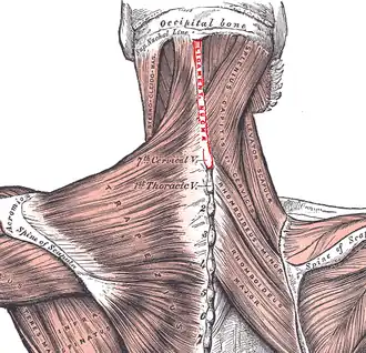 Posterior view of muscles connecting the upper extremity to the vertebral column. Nuchal ligament labeled in red at center.