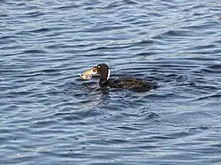 A surf scoter usually captures its food underwater and consumes it whole. They have been observed to select smaller bivalves than those available, probably because of the energy cost of processing shell matter. They also seem to select slow-swimming epifaunal crustaceans.[20]