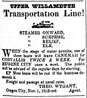 As of November 1, 1859, Surprise was running under the control of the Upper Willamette Transportation Line.[4] Other boats controlled by the line were Onward, Elk, and Relief.[4] In December 1859, the line advertised that one of its four boats would leave Canemeh for Corvallis, Oregon twice a week, and for Eugene City once a week, with freight and passage “at the usual rates.”[4] Theodore Wygant (b.1831) was the Oregon City agent for the line.[4]