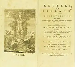 Following the family's move to Walthamstow, her father enjoyed increasing prosperity and influence in business, as well as his leisure pursuits: antiquarianism, sketching, and poetry. He formed lasting friendships with eminent men such as Thomas Gray, William Gilpin, and Richard Gough[6] (Gough was also at Cambridge with her uncle Benjamin[7] and he later bequeathed £100 each to Susannah Dorothy Dixon and her brothers[8]). In these circles, Susannah, in her early twenties, undertook her project of translating the Swedish Lutheran bishop, Uno von Troil's Letters on Iceland from the German. Susanna's English translation, Letters on Iceland: containing observations on the civil, literary, ecclesiastical, and natural history; antiquities, volcanos, basaltes, hot springs; customs, dress, manners of the inhabitants, &c. &c. made, during a voyage undertaken in the year 1772, by Joseph Banks, assisted by Dr. Solander, Dr. J. Lind, Dr. Uno von Troil, and several other literary and ingenious gentlemen (originally written in Swedish and published at Upsala in 1777 and translated into German by J. G. P. Moller), was published in three editions, two in 1780 in London and Dublin and a final London edition in 1810. One of the contributors to the letters, was the family friend, Joseph Banks.