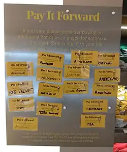 The Pending Meal movement encourages people to pay for someone else’s meal at a food outlet so the less fortunate can walk in and eat.[10]