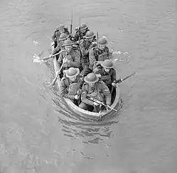 The 9th Battalion, Royal Sussex Regiment was created in July 1940. It was originally commanded by 41-year-old Lieutenant Colonel Gerald Templer.[35] The battalion formed part of the 212th Independent Infantry Brigade (Home).[36] In October 1942, the battalion was converted to armour as the 160th Regiment Royal Armoured Corps and joined the 267th Indian Armoured Brigade, which included other infantry units converted to armour.[37] As with all infantry units converted in this way, they would still have worn their infantry capbadge on the black beret of the RAC.[38] However, it returned to the infantry role in April 1943[16] and was sent with the 72nd Infantry Brigade to fight in the Burma Campaign with the British 36th Infantry Division, previously 36th Indian.[39] The battalion saw action in the Arakan, was airlifted into Myitkyina and fought its way to Mandalay by April 1945.[40]