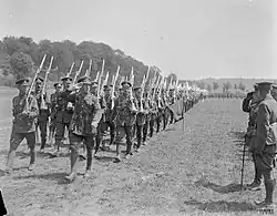 The 2nd Battalion landed in France as part of 2nd Brigade in the 1st Division in August 1914 and fought through the war on the Western Front.[17] It took part in the Battle of Mons in August 1914, the Battle of the Marne in September 1914, the Battle of the Aisne in September 1914 and the First Battle of Ypres in November 1914 as well as the Battle of Aubers Ridge in May 1915.[19] During the Battle of Loos in September 1915 Sergeant Harry Wells was awarded a posthumous Victoria Cross, when the battalion took part in an attack.[20] The battalion took part in the Battle of the Somme in Autumn 1916, the British pursuit to the Hindenburg Line in Spring 1917, the Battle of Passchendaele in October 1917, the Battle of the Lys in April 1918 and the Second Battle of Arras in August 1918.[19]