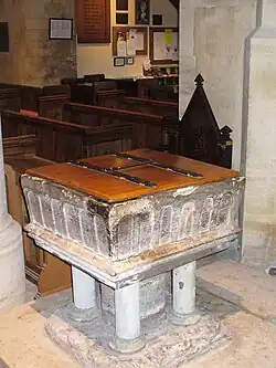 In the early 19th century, Sussex Marble quarried at Petworth rivalled many of the stones which were routinely imported from the continent, in both beauty and quality. A kind of shell marble occurring in the Wealden clay, its quarrying was concentrated on the Egremont estate at Kirdford[1] and there are accounts of the industry at nearby Plaistow. It was used in several chimney pieces at Petworth House, and in Edward the Confessor's Chapel in Westminster Abbey the tombs of Edward III and of Richard II and his Queen are both in "grey Petworth Marble".[4] At Canterbury Cathedral the Archbishop's chair is an entire piece of the stone.[5] Embellishment of the nave of Chichester Cathedral is in both Purbeck and Petworth Marbles;[6] the latter was used for the pillars of the upper triforium which even then showed "some decomposition of the shelly particles". Church fittings such as altars, rails, piers and floors have been made from the material, as have memorial tablets and parts of tombs.[2] Sussex churches with Sussex Marble fonts include St George's at Trotton, St Peter's at Ardingly and St Mary's at West Chiltington.[1] The lychgate at St Mary Magdalene's Church, Bolney, given to the church in 1905, stands on a base of Sussex Marble.[7]