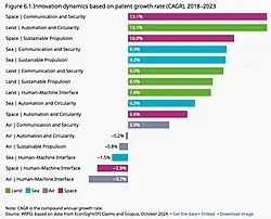 Sustainable propulsion and communication and security technologies represent the largest number of patent publication increase between 2000 and 2023. Sustainable propulsion is the most patented technology in land and sea transport whilst communication and security represent over 85% of the patents in space transport.[98]